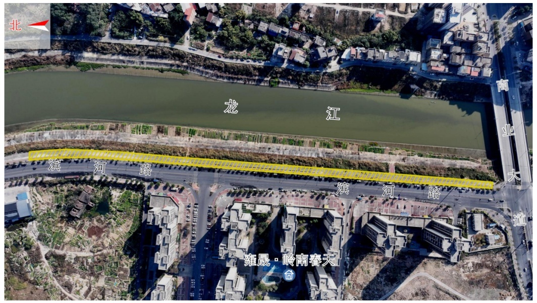 1.如下图所示亮黄色区域所示,位于滨河路岭南春天楼盘对开靠河侧人行道及人行道外水泥地,不含机动车道,长约800米,以政府现场指示区域为准;