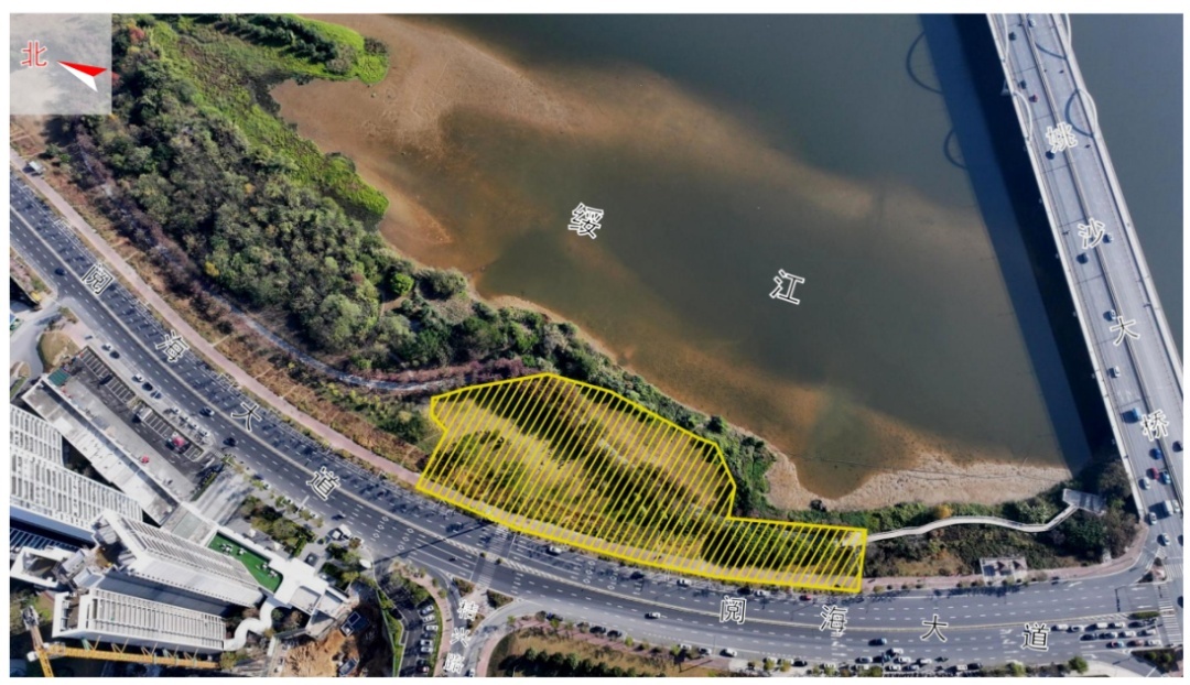 2.如下图所示亮黄色区域所示,位于阅海大道与桔兴路T字路口正东方向约50米的湿地公园,不含机动车道,以政府现场指示区域为准;