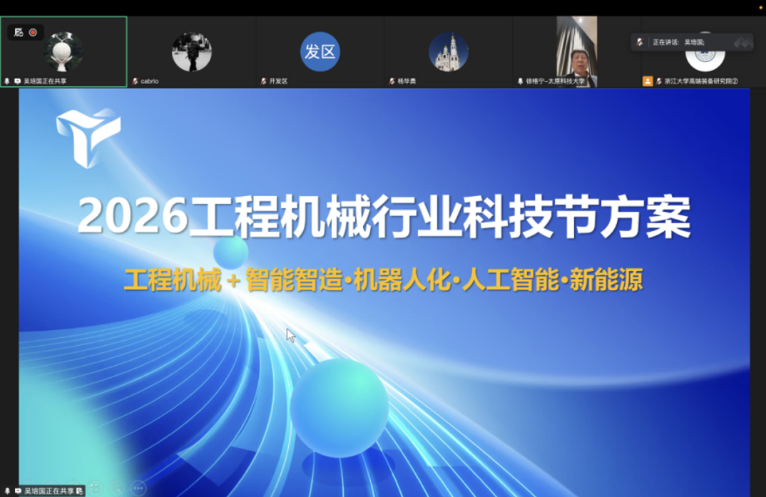 3月27日,2026工程机械行业科技节组委会第一次会议在线上召开。本届科技节由中国工程机械工业协会(以下简称协会)与浙江大学高端装备研究院(以下简称研究院)共同主办。为扎实推进各项工作顺利开展,会议齐聚行业权威专家、承办地代表及组委会主任委员、组委会顾问、组委会副主任委员及委员共40余人,围绕科技节筹备工作谋篇布局、凝聚共识。